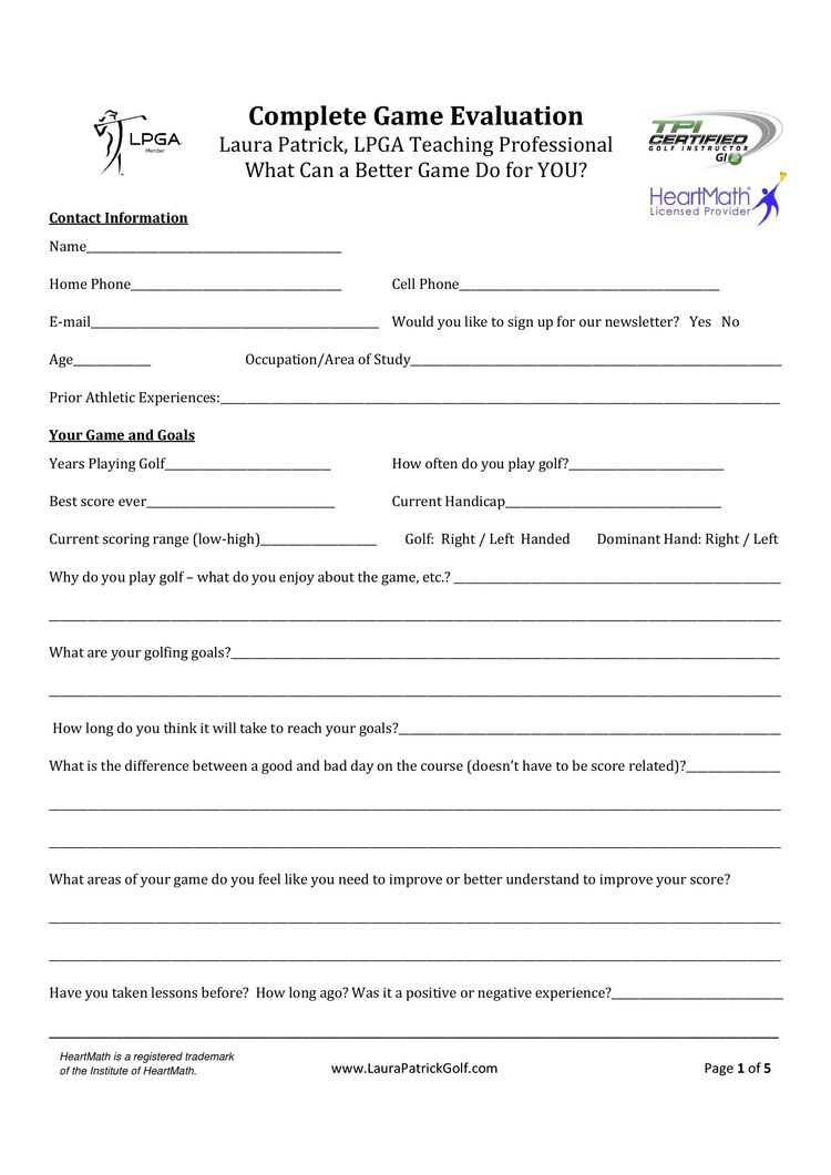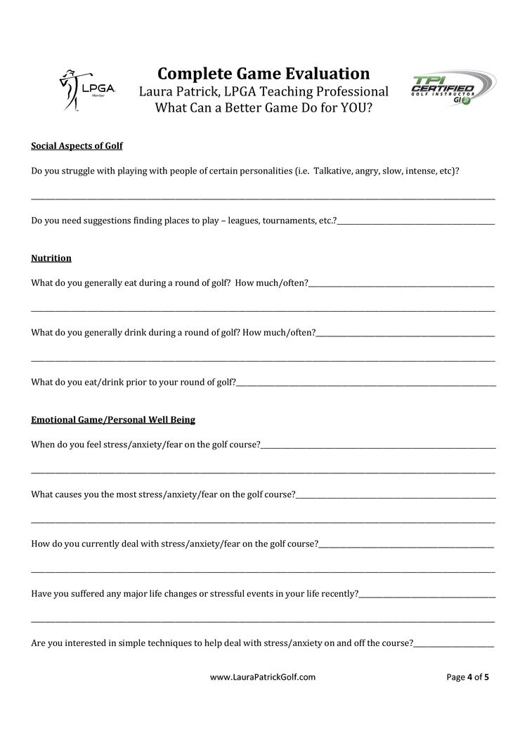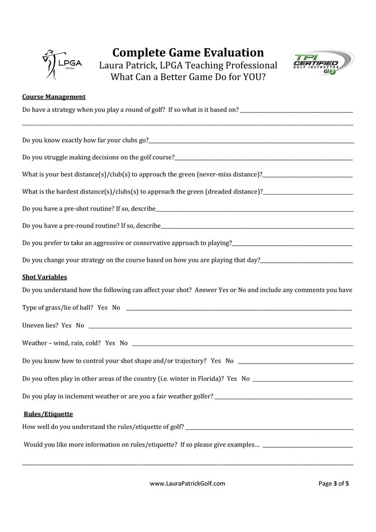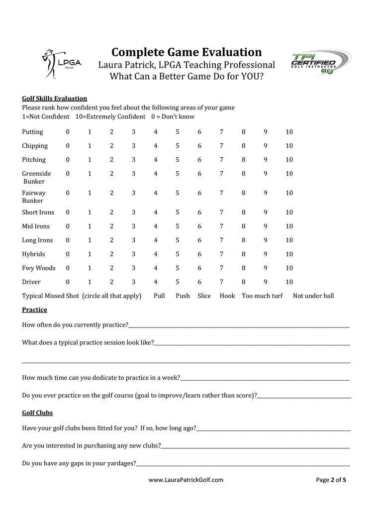 Ever wonder what areas of your game are important to your success and where you need to focus your efforts to improve? Laura has created a Complete Game Evaluation that will help identify high impact areas of improvement. Click on the link below the document download your Game Evaluation Form by Laura Patrick today!
